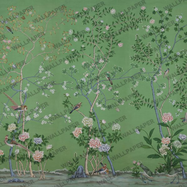 Yeşil Zeminli Çiçek Daldaki Kuşlar 3D Duvar Kağıdı