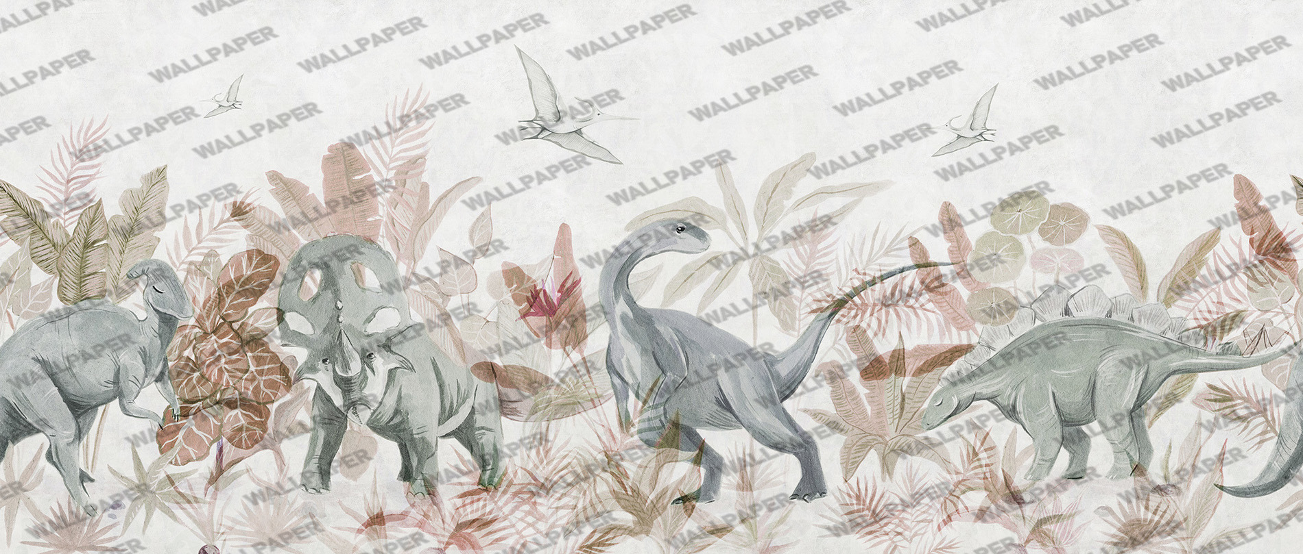 - Açık Renkler’de Tropikalı ve Dinozorlu 3D Duvar Kağıdı , 100-105cm genişliğinde parçalar halinde üretilmektedir.