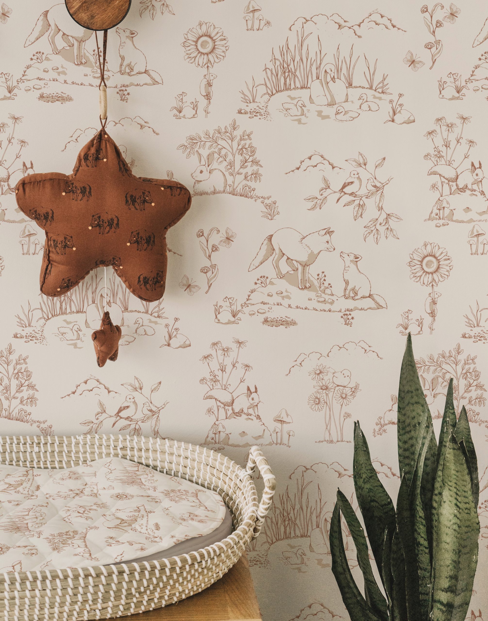 - Bej Minik Orman Dostları Duvar Kağıdı, 100-105cm genişliğinde parçalar halinde üretilmektedir.