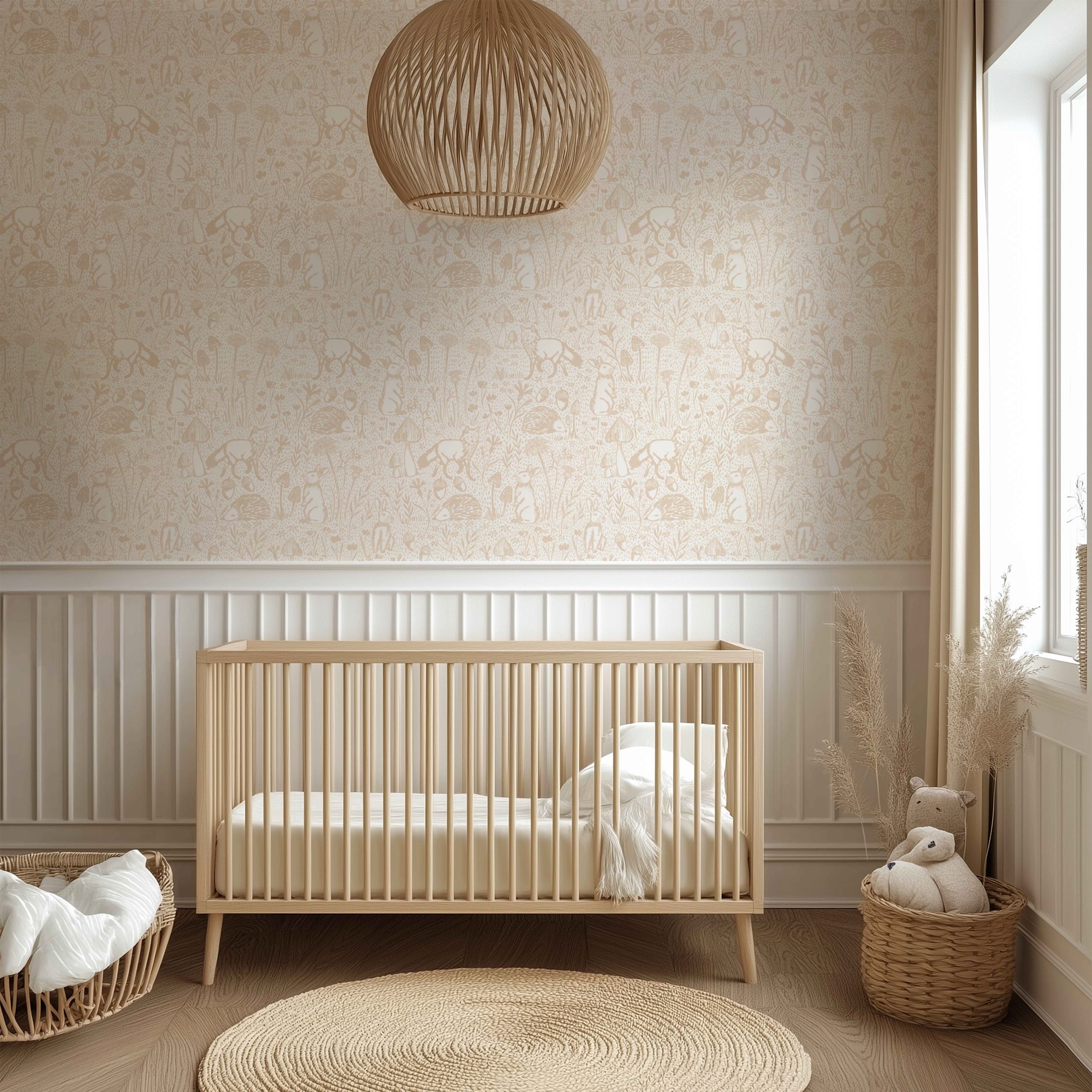 • Bej Orman Dostları Tilki ve Tavşanlı Duvar Kağıdı, 100-105cm genişliğinde parçalar halinde üretilmektedir.