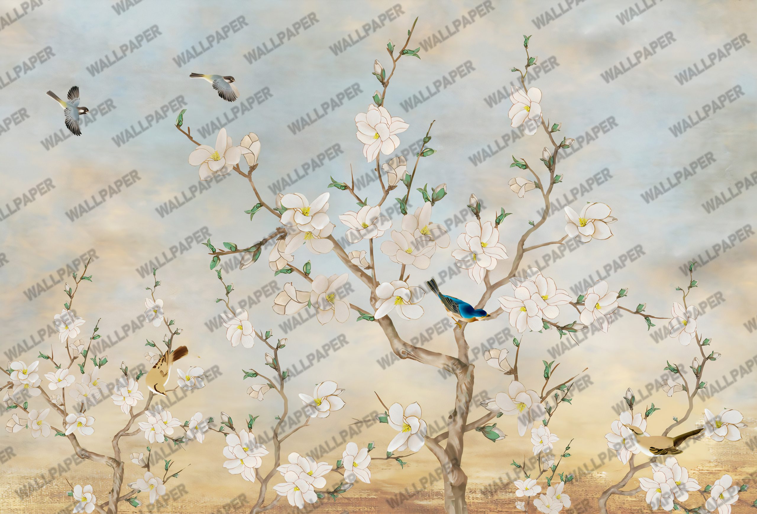 Beyaz Çiçek Ağaçlı Duvar Kağıdı, en yüksek kalitede (high pass) detay zenginliği gözetilerek, en doğru renklerde ürünün üretimi sağlanır.