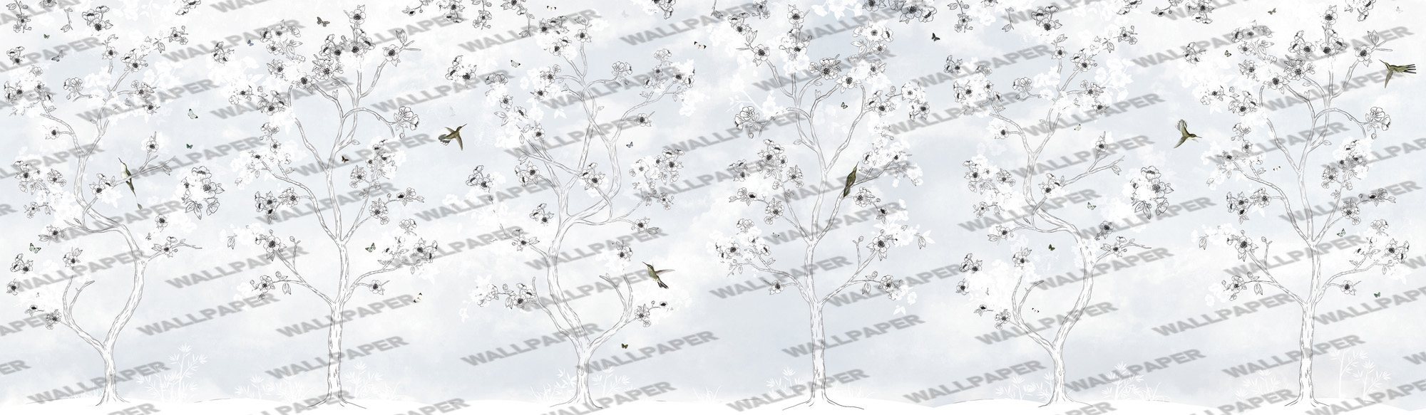 - Beyaz Zeminli Ağaç Dallındaki Kuşlar 3D Duvar Kağıdı, 100-105cm genişliğinde parçalar halinde üretilmektedir.