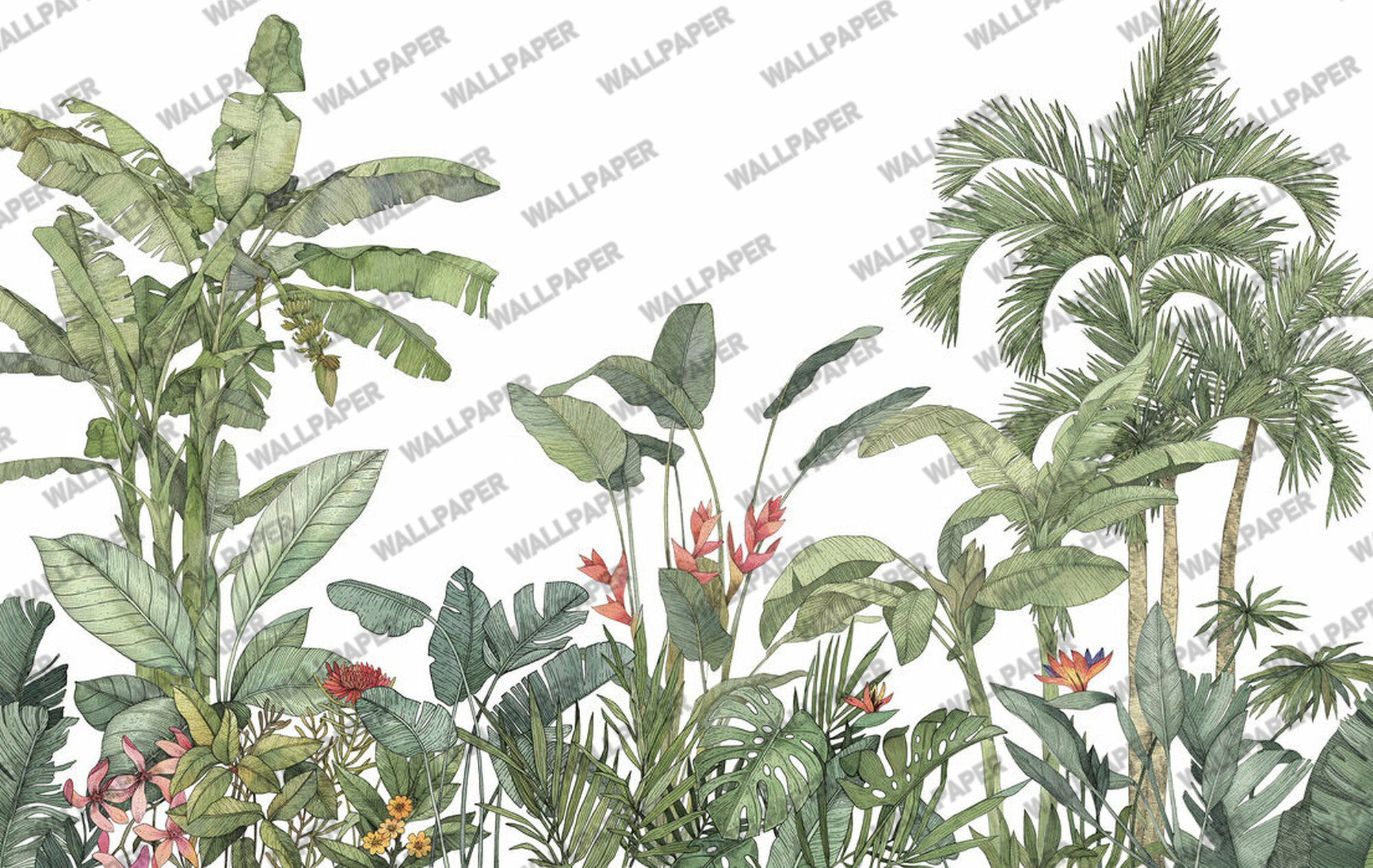 Büyük Ağaçlı Tropikal Desenli Duvar Kağıdı, en yüksek kalitede (high pass) detay zenginliği gözetilerek, en doğru renklerde ürünün üretimi sağlanır.