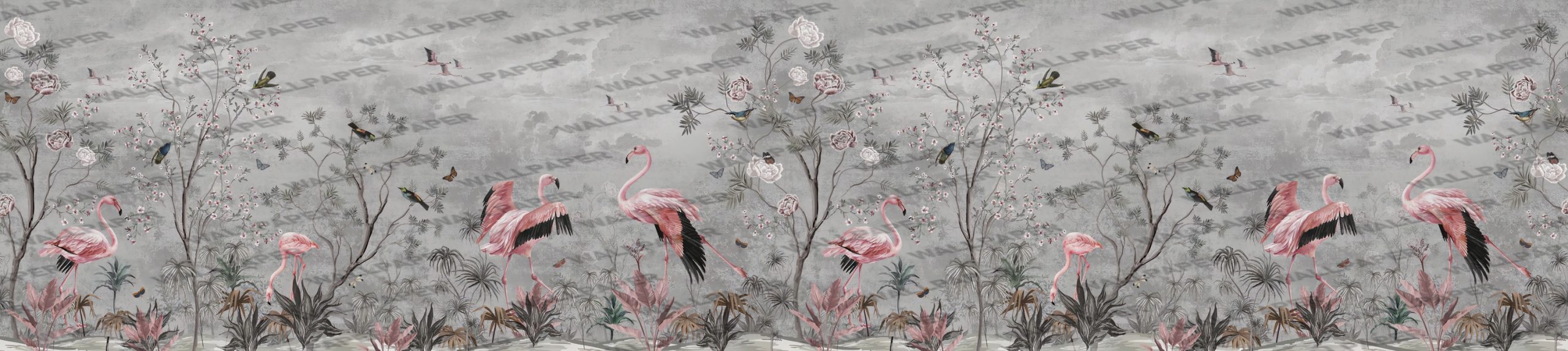 - Flamingo Kuşları ve Gül Ağacı Duvar Kağıdı, 100-105cm genişliğinde parçalar halinde üretilmektedir.