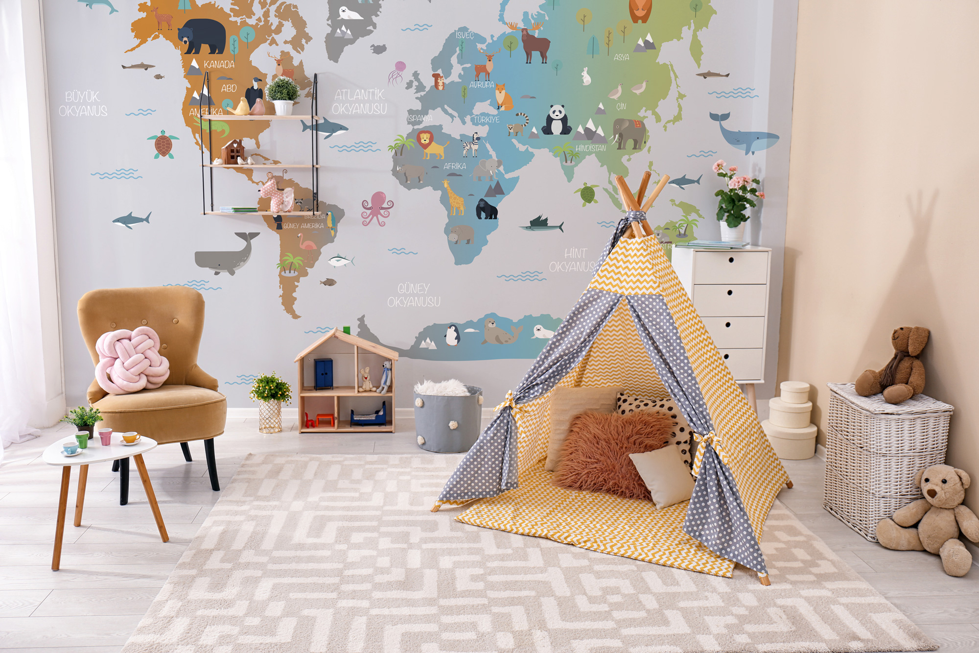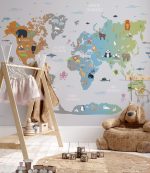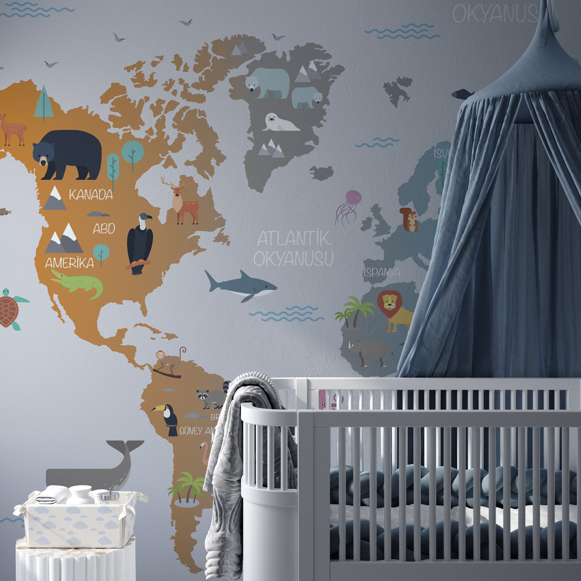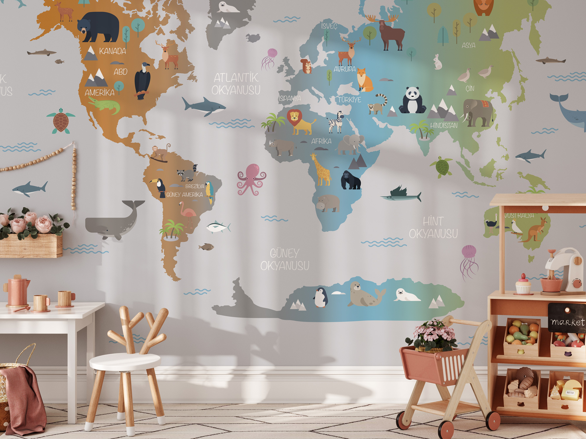 Hayvan Figürlü Eğitici Dünya Haritası Duvar Kağıdı üretimi, uygulanmasını isteyeceğiniz boyut ve konumuna uygun olarak talepleriniz doğrultusunda size özel imal edilir.