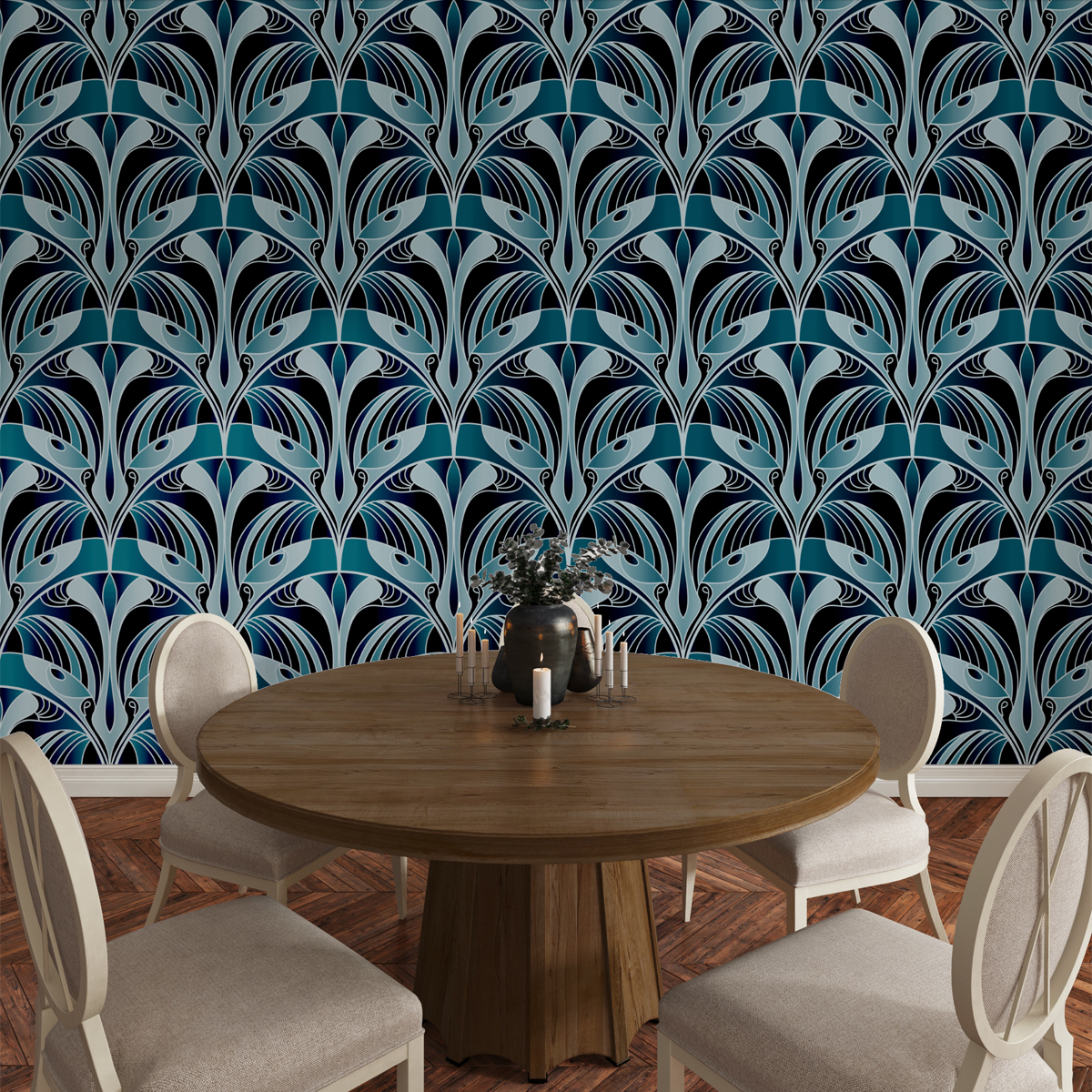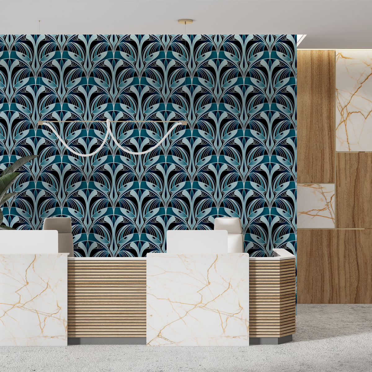 Mavi Tonlarda Art Deco Duvar Kağıdı üretimi , uygulanmasını isteyeceğiniz boyut ve konumuna uygun olarak talepleriniz doğrultusunda size özel imal edilir.