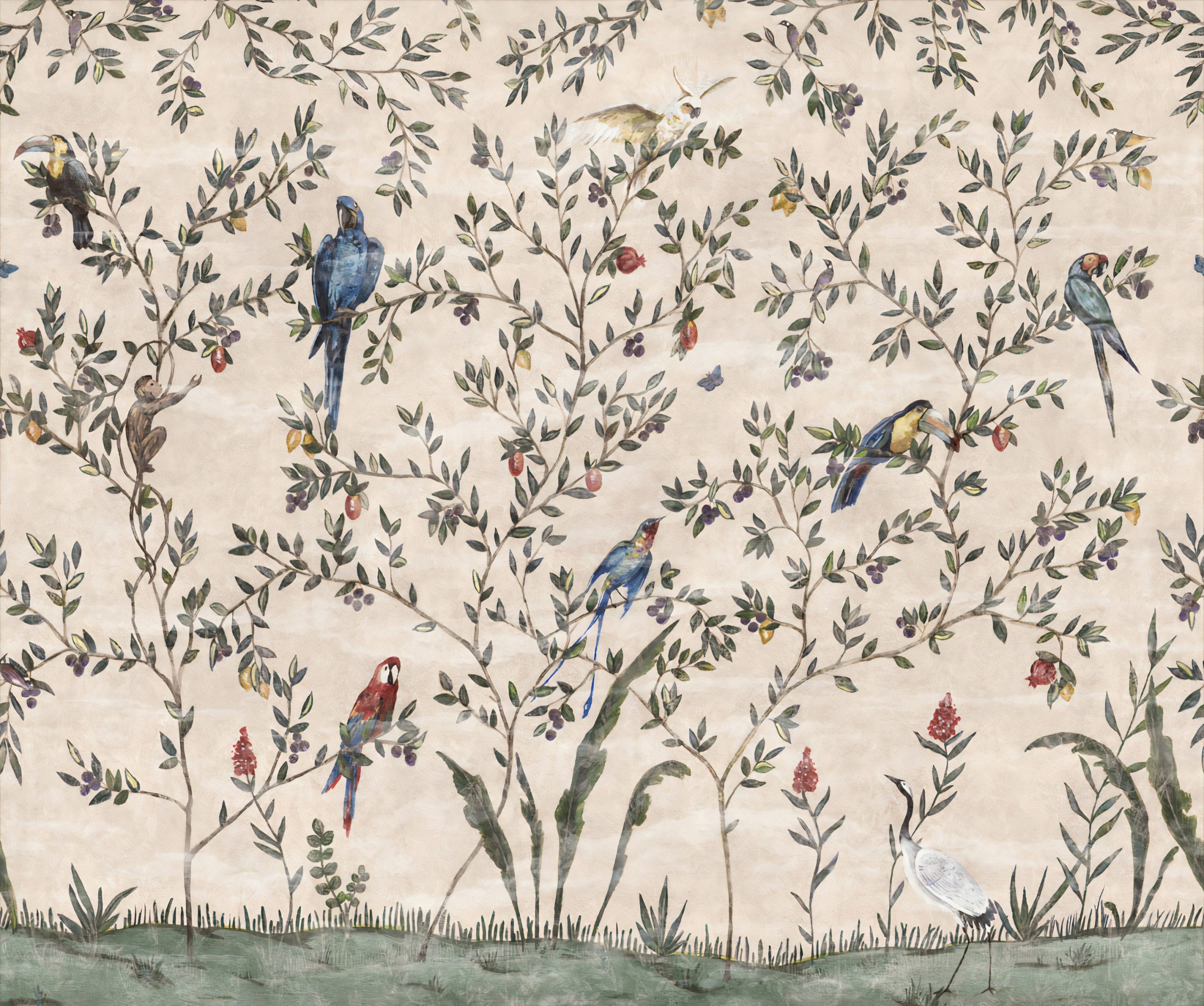 - Pembe Zemin Dallın Üzerindeki Kuşlu 3D Duvar Kağıdı, 100-105cm genişliğinde parçalar halinde üretilmektedir.