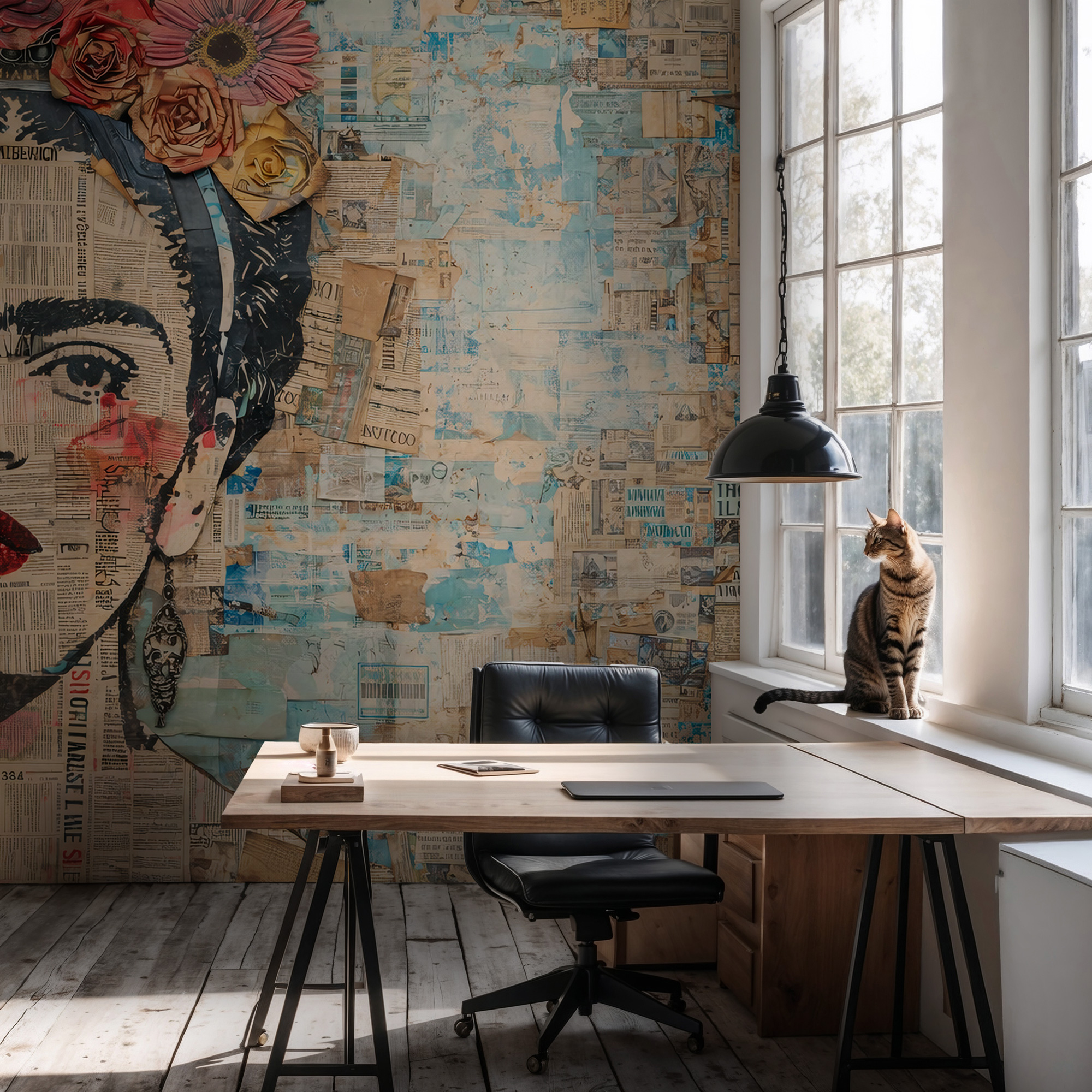 Sanatsal Frida Kolaj Duvar Kağıdı, insan sağlığı üzerinde olumsuz bir etki göstermez. Kokusuz ve havalandırma gerektirmeyen duvar posterlerimiz ofis ve yaşam alanlarınız için idealdir.