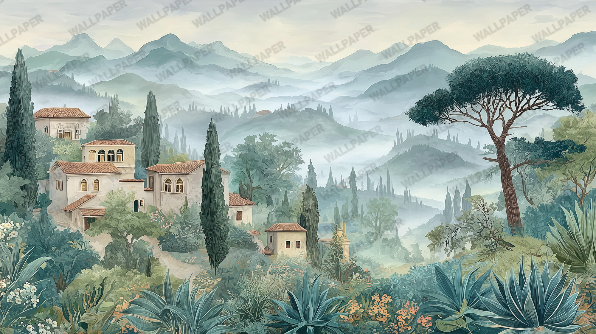 Selvi Ağaçları Köy Manzarası Duvar Kağıdı Ürün Bilgisi
