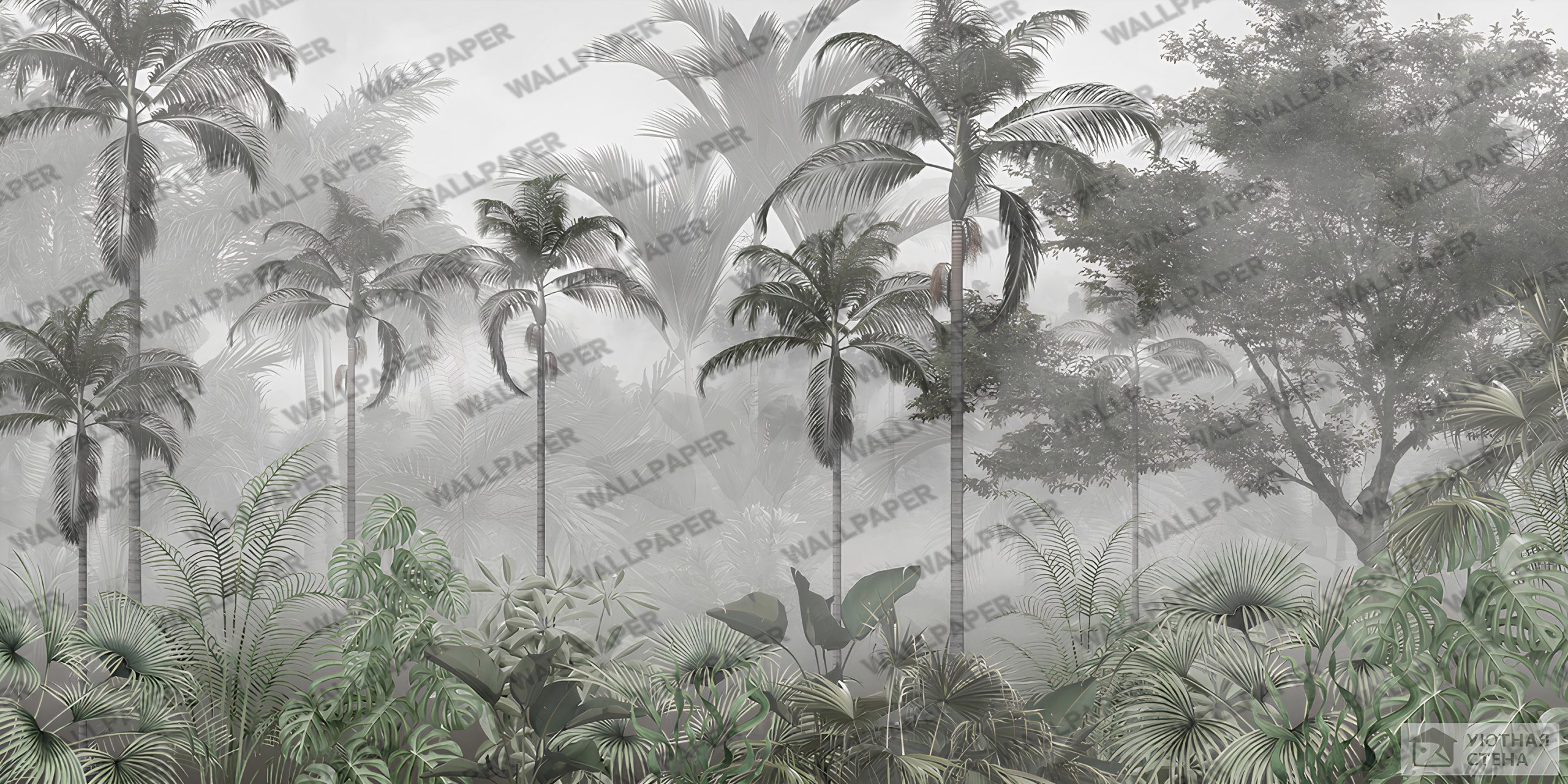 - Siyah Beyaz Palmiye Ağaçlı Tropikal Orman Duvar Kağıdı , 100-105cm genişliğinde parçalar halinde üretilmektedir.