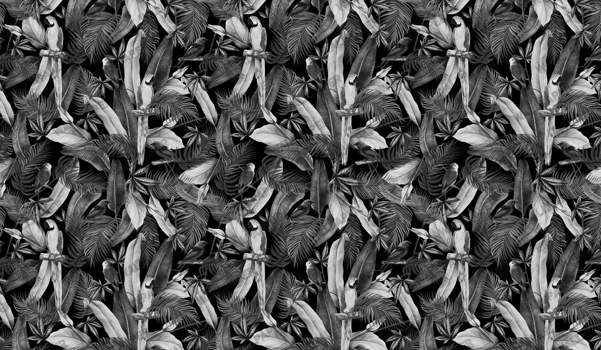 • Siyah Beyaz Papağan Tropikal Duvar Kağıdı, 100-105cm genişliğinde parçalar halinde üretilmektedir.