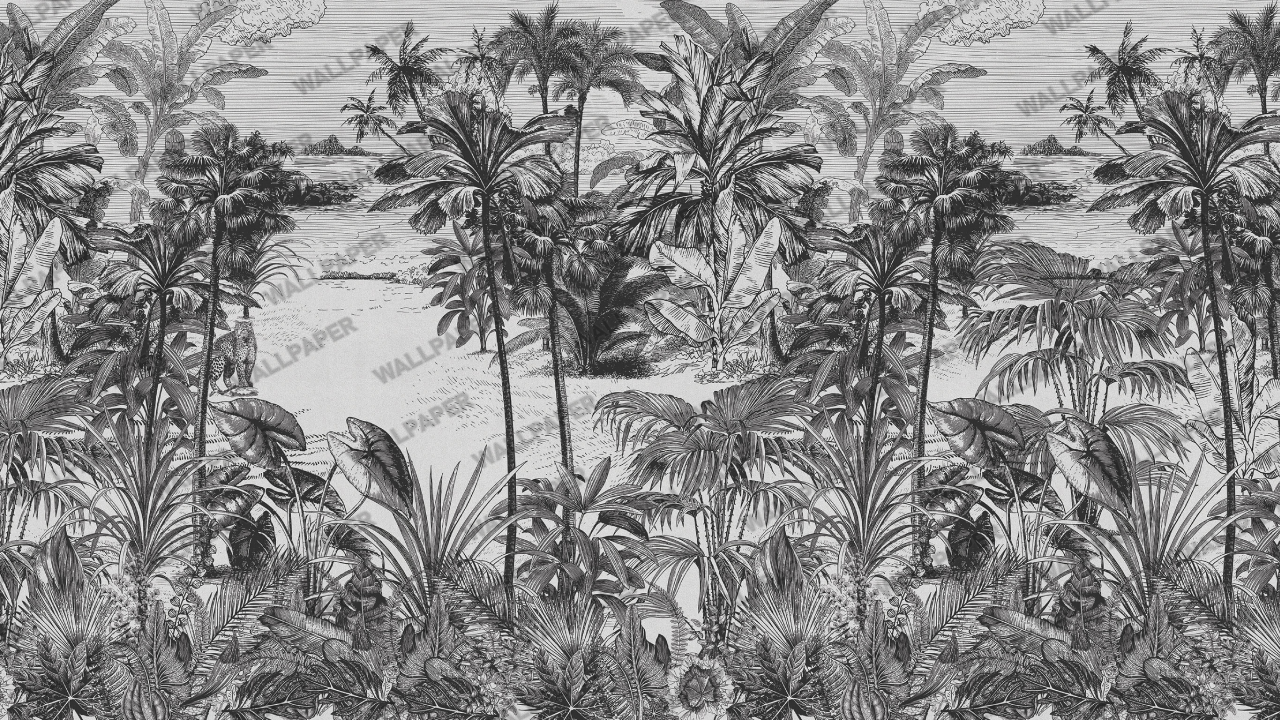 Siyah Beyaz Tropikal Orman ve Deniz Manzaralı Duvar Kağıdı Ürün Bilgisi