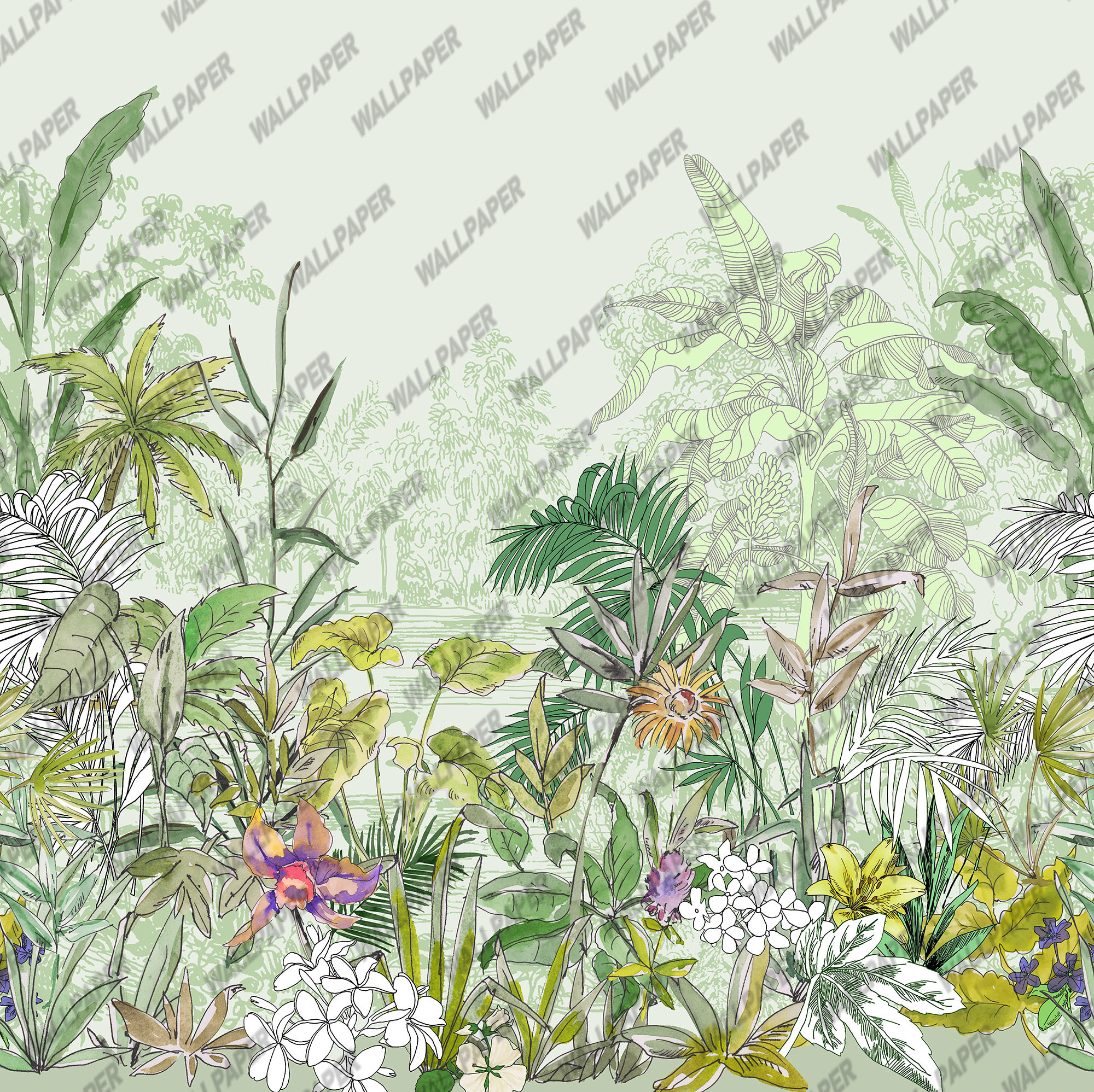 Sulu Boya Tarzında Göl Kenarındaki Tropikal Çiçekler Duvar Kağıdı üretimi, uygulanmasını isteyeceğiniz boyut ve konumuna uygun olarak talepleriniz doğrultusunda size özel imal edilir.