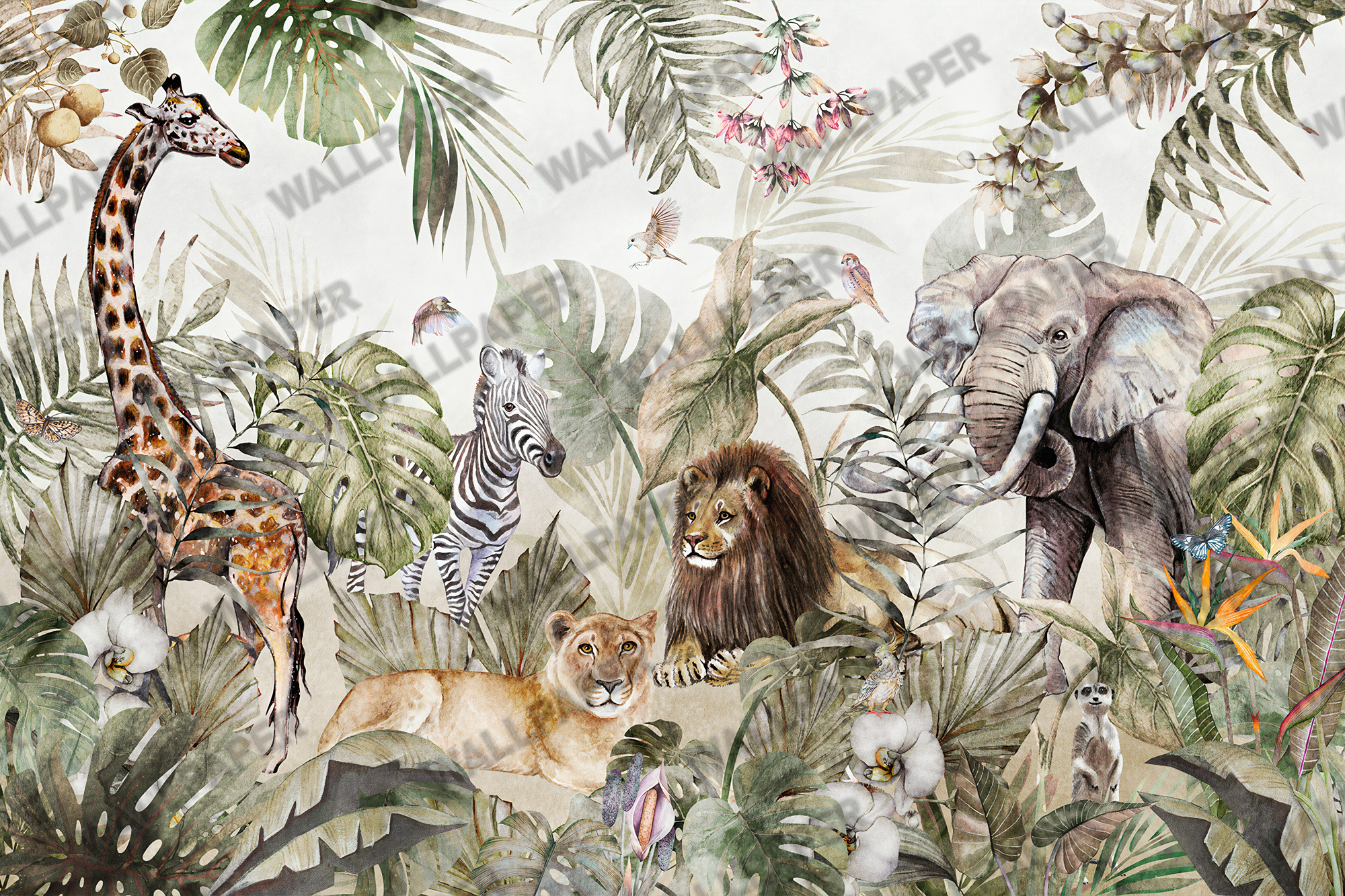 Tropikal Ormanda Hayvan Dostlar Duvar Kağıdı , en yüksek kalitede (high pass) detay zenginliği gözetilerek, en doğru renklerde ürünün üretimi sağlanır.