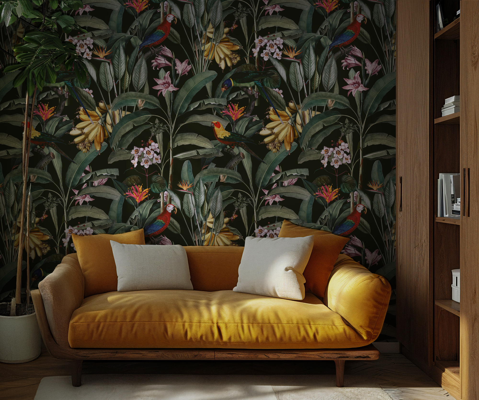Tropikal Papağanlı Çiçekli Duvar Kağıdı üretimi, uygulanmasını isteyeceğiniz boyut ve konumuna uygun olarak talepleriniz doğrultusunda size özel imal edilir.