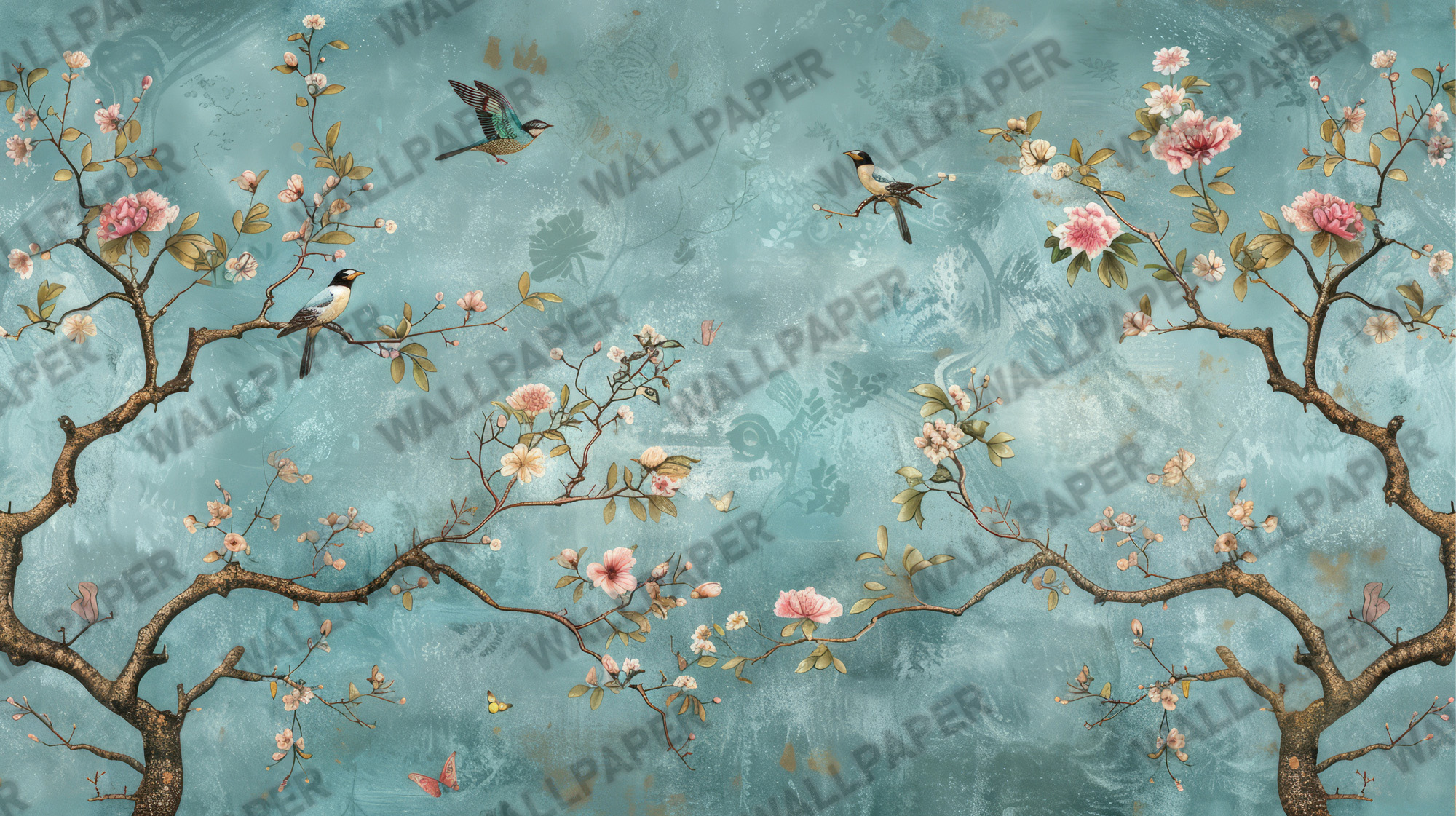 Turkuaz Fon da Kuşlar ve Çiçekler Duvar Kağıdı Ürün Bilgisi