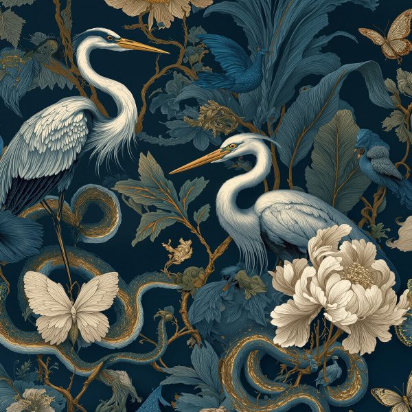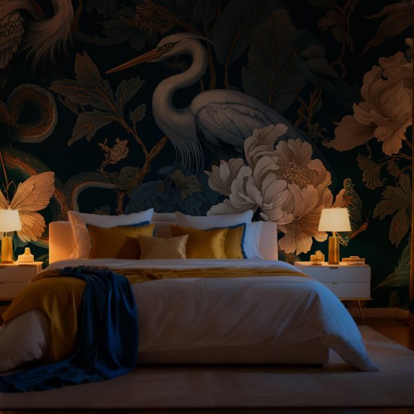 Altın Detaylı Tropikal Kuş ve Çiçek Duvar Kağıdı