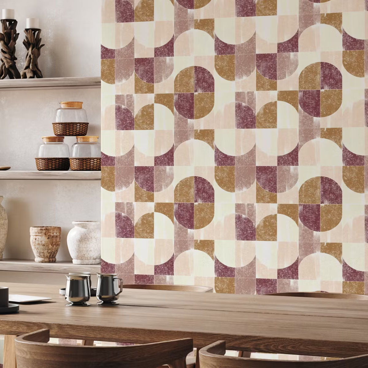 - Yarım Daire Pembe Geometrik Desen Duvar Kağıdı , 100-105cm genişliğinde parçalar halinde üretilmektedir.