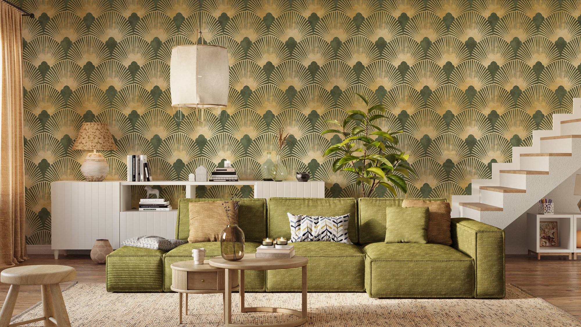 Yeşil ve Altın Rengi Geometrik Desenli Duvar Kağıdı özellikleri nelerdir?